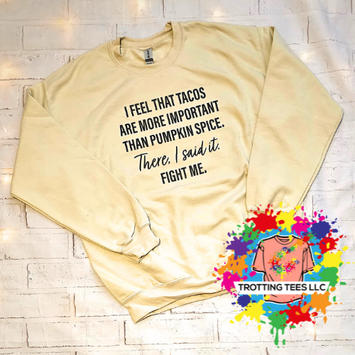 Can't decide between Tacos or Pumpkin Spice? Let this shirt do the fighting for you! Show off your playful side with this quirky and fun sweatshirt that is sure to turn heads. It's a battle of the flavors and you're the winner!